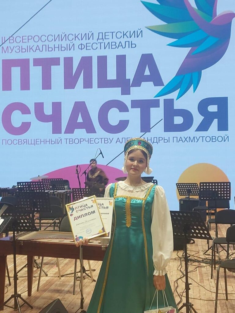 Екатерина исполнила песню «Ой, грибы, грибочки» из репертуара Людмилы Зыкиной, которую Александра Пахмутова называла олицетворением русской души. Юная волгодончанка выступила в сопровождении Оркестра русских народных инструментов им. Н.Н. Калинина под управлением заслуженной артистки РФ, художественного руководителя коллектива — Галины Иванковой.