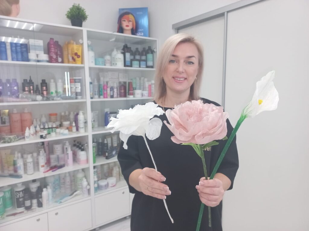 — Мой цветок был пион. Я делала его вручную: формировала лепесток за лепестком. Внимательно подбирала оттенки волос, выравнивала текстуру, обрабатывала края. Каждый лепесток нужно было аккуратно выгибать пальцами, придавая ему движение — чтобы получился «живой» эффект, — рассказывает Светлана.