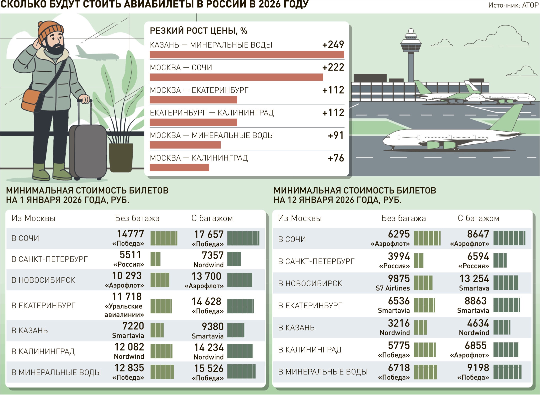 Главное новшество наступающего года в том, что в первый рабочий день, который в 2026 году выпадает на 12 января, билеты не становятся дешевле. Средний рост стоимости авиабилетов по минимальному тарифу в этот день составляет +21,9% (без багажа) и +19,1% (с багажом).