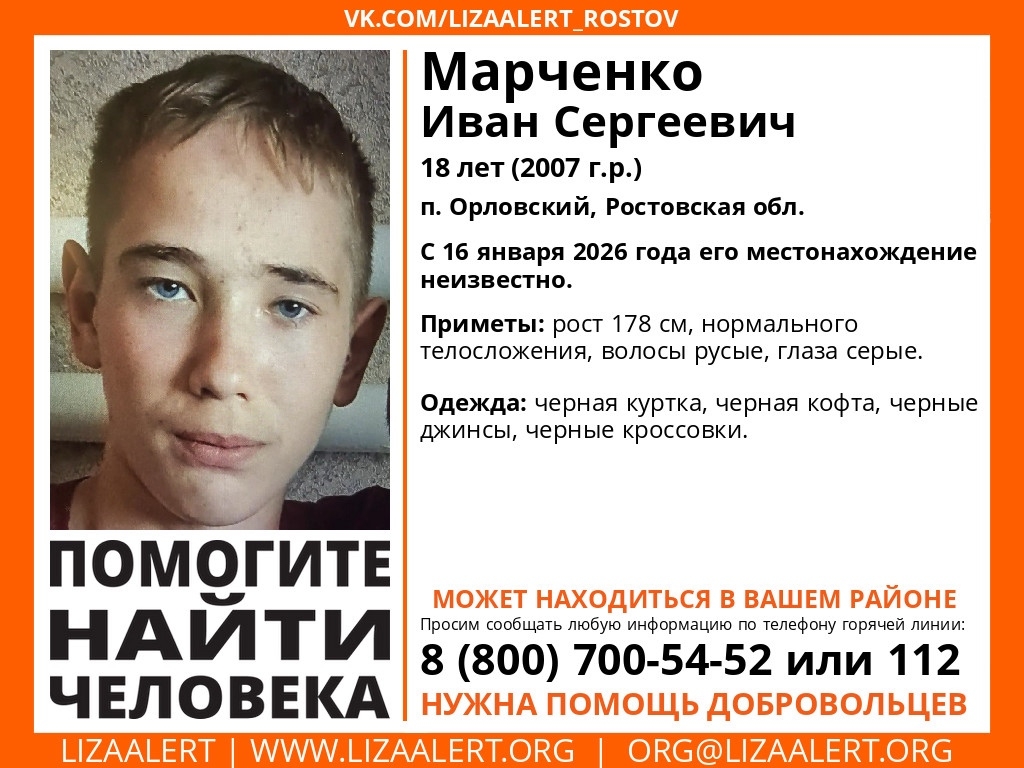 В Ростовской области продолжают искать 18-летнего Ивана Марченко, который пропал без вести 16 января 2026 года в поселке Орловский. Об этом сообщили представители регионального поискового отряда «ЛизаАлерт». Местонахождение молодого человека остается неизвестным уже неделю.