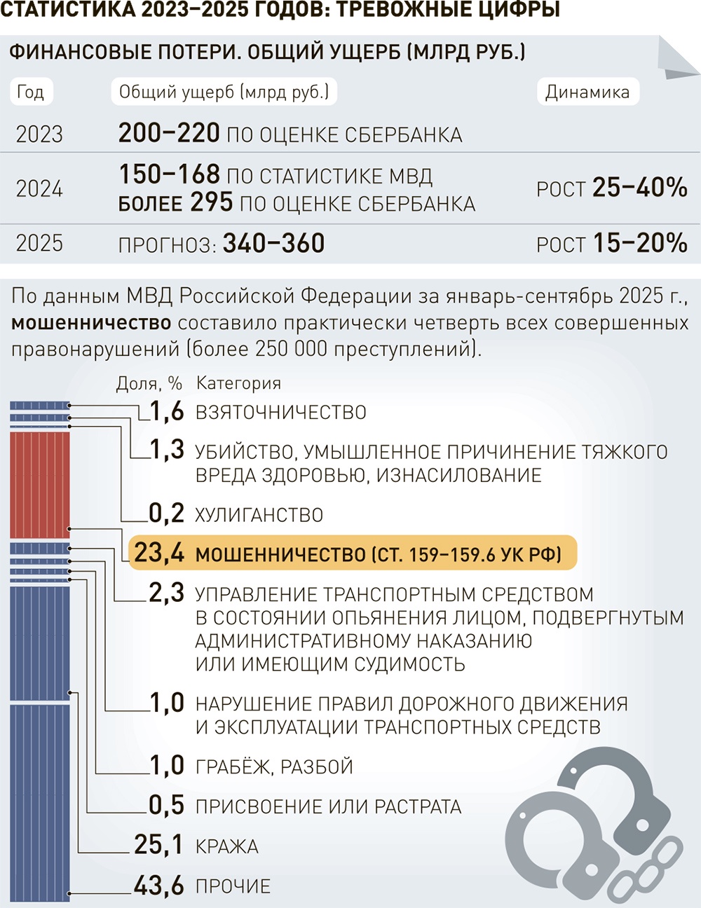 По данным МВД России за январь — сентябрь2025 года, мошенничество составило практически четверть всех совершенных правонарушений — более 250 000 преступлений.