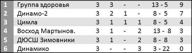 «Динамико» — «Восход» 0: 9; «Динамо-2» — «ДЮСШ» 2: 1; «»Группа здоровья» — «Цимла» 2: 1; «Смена-2» — «Зампикс-2» 1: 3;