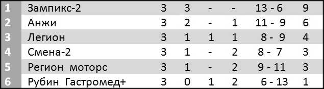«Регио Моторс» — «Анжи» 3: 5; «Рубин гастромел+» — «Легион» 3: 3;