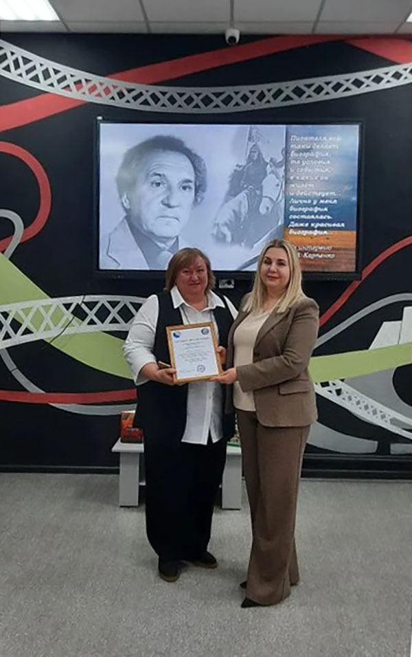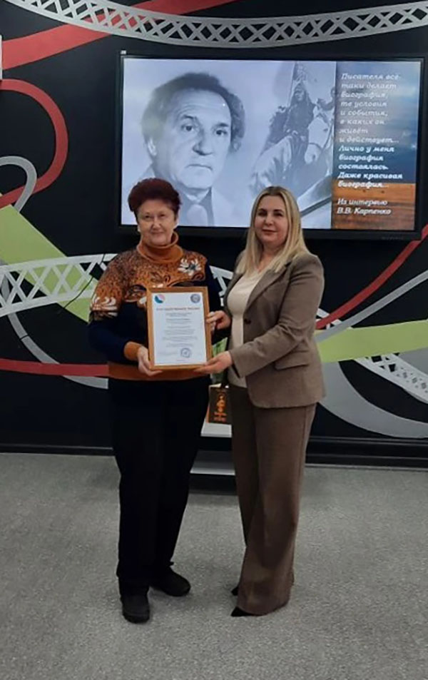 В завершение литературного праздника за большой вклад в увековечивание памяти и популяризацию творчества Владимира Карпенко директор Центральной библиотечной системы Волгодонска Инна Гуро вручила благодарственные письма. Ими были отмечены заслуги председателя общественного совета по культуре и искусству Людмилы Мурашовой, директора Волгодонского эколого-исторического музея Ирины Павлинок, председателя регионального отделения Российского профессионального союза литераторов Татьяны Мажориной, председателя литературно-творческого объединения «Лира» Надежды Елизарьевой, а также заведующей библиотекой №9 имени В.В. Карпенко Анны Рыжовой.