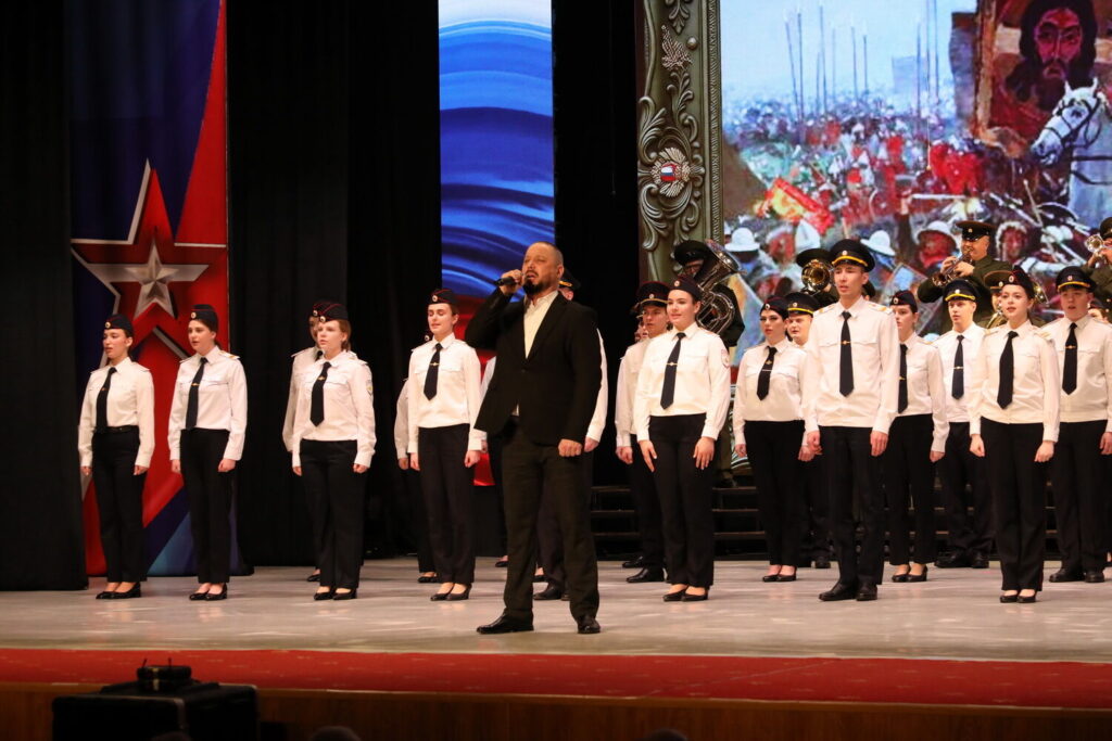В вестибюле дворца культуры гостей встречал духовой оркестр. Прологом стало масштабное действо «Солдаты Отчизны» с участием духового оркестра, юнармейцев и воспитанников Волгодонского филиала РЮИ. Были торжественно внесены флаги России и 150-й ордена Кутузова II степени Идрицкой стрелковой дивизии.