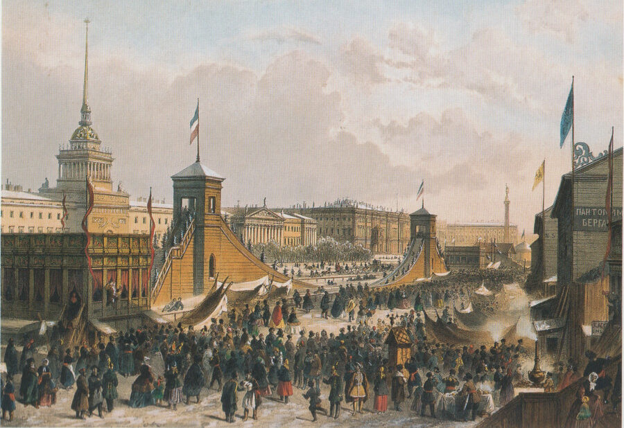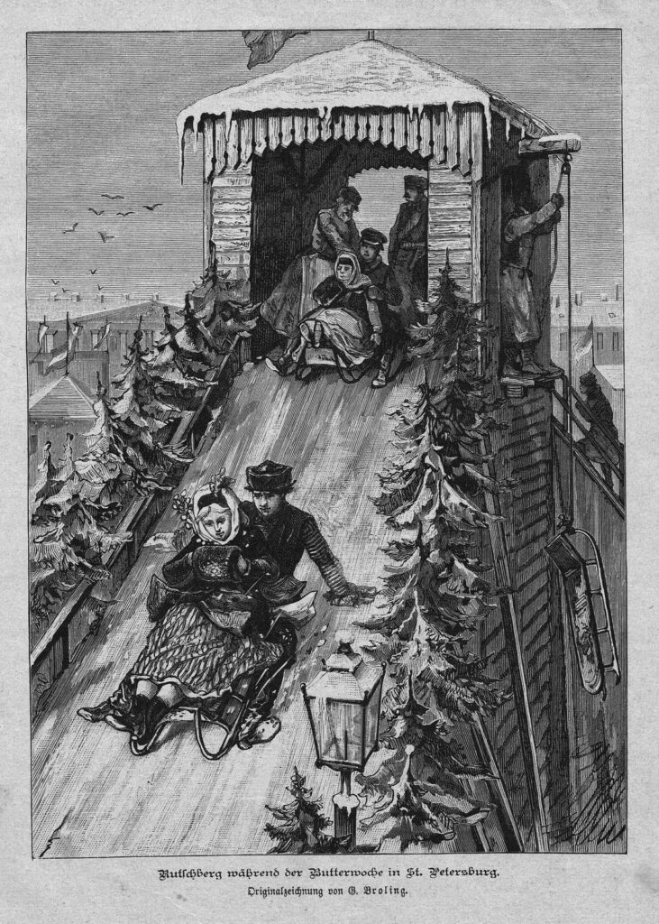 К слову, это развлечение потом пришло в Европу, а потом и в Новый свет, под названием «русские горки». А потом, многократно модернизировавшись, вернулось, но называлось при этом уже горками «американскими». В наше время в больших российских городах традицию ставить на Масленицу ледяные горы стараются возродить, но, судя по старым гравюрам, нынешние «горы» куда скромнее огромных старинных. Но и, стоит признать, гораздо безопаснее.