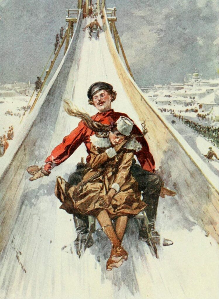 По накатанному лотку втаскивают веревками вернувшиеся с другой горы высокие сани с бархатными скамейками – «дилижаны» – на шестерых. Сбившиеся с ног катальщики, статные молодцы, ведущие «дилижаны» с гор, стоя на коньках сзади, весело в меру пьяны. Работа строгая, не моргни: крепко держись за поручни, крепче веди на скате, «на корыте».