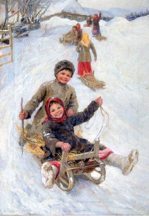 – Со мной не бойся, купцов катаю! – говорит он, сажаясь верхом на саночки.