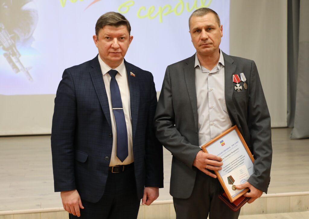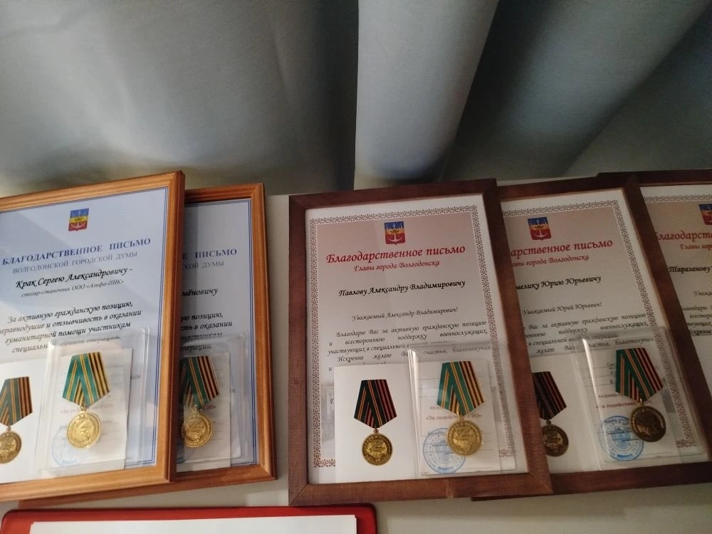 Подарки были переданы в госпиталь, а их часть ушла солдатам «за ленточку». Готовятся еще две отправки гуманитарной помощи. В центре «Мы вместе» не прекращается работа – все помогают землякам, чем могут. Кто-то плетет маскировочные сети, кто-то льет окопные свечи, кто-то шьет мягкие носилки и пятиточечники, кто-то за рулем машины везет груз на передовую и в госпиталь. На открытии выставки «С памятью в сердце» в лицее № 24, где была представлена передвижная экспозиция семейных фотографий воинов-героев СВО, благодарственные письма администрации и Думы Волгодонска, а также медали «За содействие специальной военной операции» вручили нашим волонтерам – Константину Таразанову, Сергею Смелику, Александру Павлову, Сергею Крак, Дмитрию Аксенову и Михаилу Рейкину.