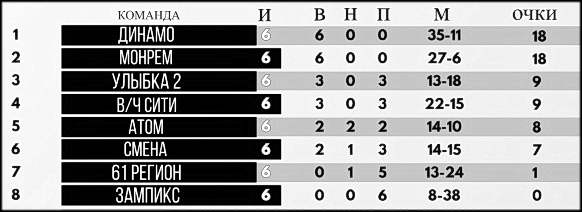 В воскресенье, 15 марта в спортивном комплексе «Олимп» состоится завершающий, 7-ой тур Открытого чемпионата Волгодонска по футзалу в высшей лиге. Пока ясно одно — команды «Динамо» и «Монрем» сыграют в этот день за «золотые» медали. А вот за «бронзу» развернётся нешуточная борьба четырёх команд . Это «Улыбка- 2″ из Зимовников», «ВЧ СИТИ», «Атом» и «Смена».