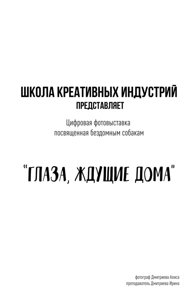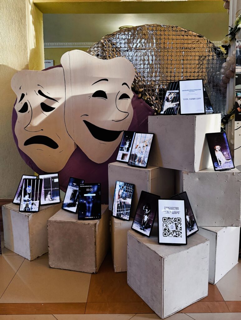 Параллельно со спектаклем в фойе была открыта цифровая фотовыставка «Глаза, ждущие дома». Её подготовили ученица ШКИ Алиса Дмитриева и методист Ирина Дмитриева. Они сфотографировали собак из питомника общественной организации волонтёров «Делай Добро». На выставке представлены трогательные портреты бездомных животных, а QR-код ведёт на страницу сообщества ДЕЛАЙ ДОБРО. Бездомные Животные Волгодонска, где можно узнать, как помочь питомцам и, возможно, найти себе надёжного и преданного друга.