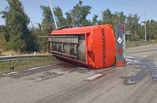 На Романовском шоссе опрокинулась цистерна бензовоза. Движение перекрыто