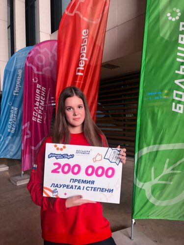 Она стала абсолютным победителем 6‑го сезона Всероссийского конкурса «Большая перемена» в вызове «Твори» среди школьников 8–10 классов и обладателем приза в 200 000 рублей!